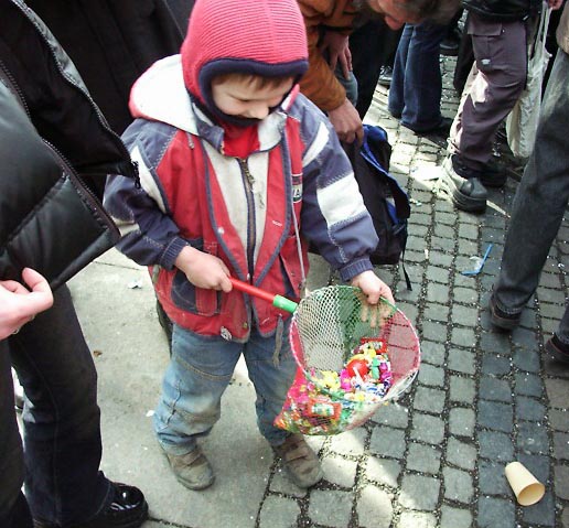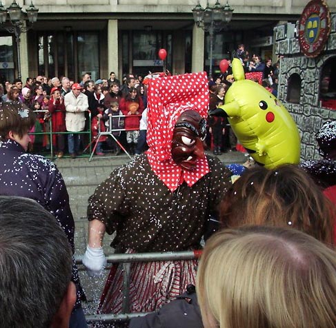 カーニバルでは山車の上からキャンディーがまかれます。特別な物ではないのですが、カーニバルだとなんだかありがたいものに思えてくるから不思議。子供だけでなく大人もまじめになってキャンディーを集めます。 |