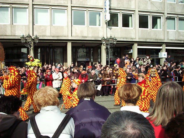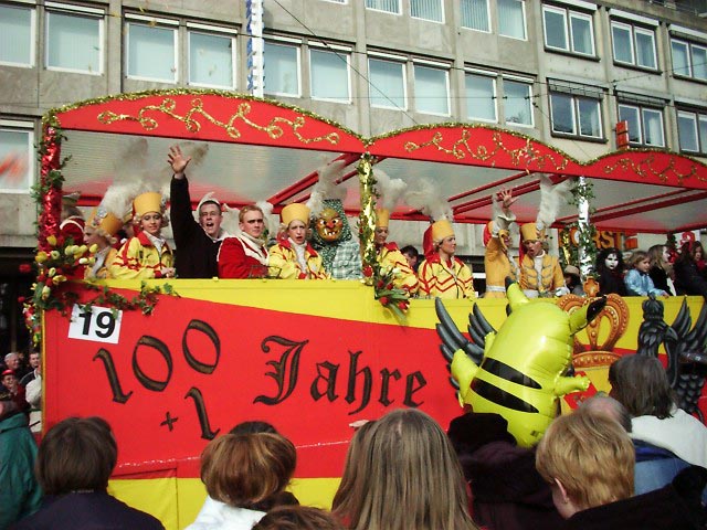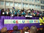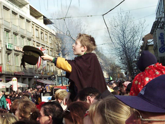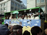 カールスルーエのカーニバルは2月27日に行われましたが、この時期としては珍しく快晴。街のメインストリート約5キロを、ブラズバンド、コスチュームを着たグループ、山車(飾り付けたトラック)など、約50のグループが練り歩きました。人出は史上最高の25万人。人口30万弱の街にこれだけ集まるのですからたいしたものです。