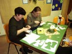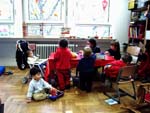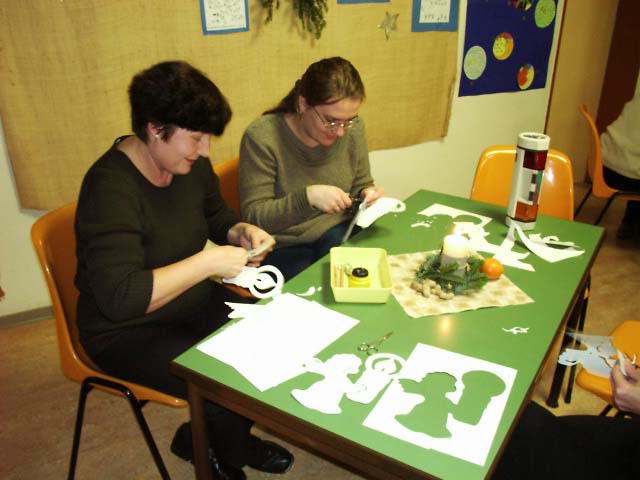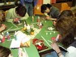 12月初めに行われた幼稚園の“クリスマスの飾りつくり”に参加しました。父母対象の集まりで、年末の父母親睦会もかねているようです。20人ほど集まりましたが、ほとんどがお母さん。“お父さんは家で子供と留守番”というパターンが多いみたい。その方が子供が喜ぶのだとか。始めに歌を歌って、それからグループに分かれて飾り作りが始まりました。