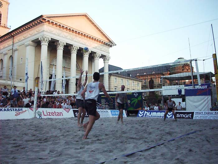 中央広場に突如として現れたビーチバレー。中央広場は多目的に使われますが、この週末は海砂を敷き詰めてビーチバレー大会です。砂はバルト海あたりから持ってきたのでしょうか。この大会、週末ごとに全国20数箇所の街を回っています。選手、観客、DJともかなりの盛り上がり。後ろに見える建物とコートのアンバランスが妙! |