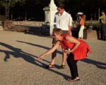 4、5メートル離れたところに置いた目標に向かって、重さ数キロの鉄のボールを投げます。ゲームの名前を聞いたんですが忘れてしまいました。もとはフランスのスポーツらしいです。1人3投して目標の一番近くへ投げた人が勝ち。強烈なバックスピンをかけたりしますが、凝った投げ方をするよりシンプルに投げる方がうまくいくみたい。 |