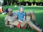 週末の昼下がり、公園はサッカーをしたり陽に焼いたりする若者達の姿が目立ちます。もちろん子供連れの家族もたくさん。赤ちゃんはお父さんのお腹の上で御満悦。 |