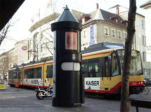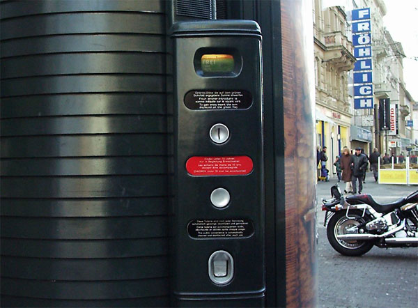 広告塔もかねていて、裏側には大きな広告や写真が貼ってあります。日本なら普通の公衆トイレは無料ですが、ドイツをはじめとするヨーロッパでは有料が多いです。このトイレは1回50ペニヒ(約30円)必要。