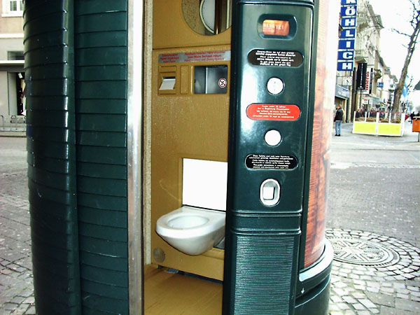 人通りが多い大通りにニョキッと立っていて、すぐわきを路面電車がガタガタと走ってます。こういうトイレを使う人は少ないようで、出入りする人の姿を見たためしががありません。やっぱり、落ち着いて用を足すのは難しそうで、緊急用といった感じ。平日なら、マクドナルドやデパートのトイレを無料(?)で使えますしね。